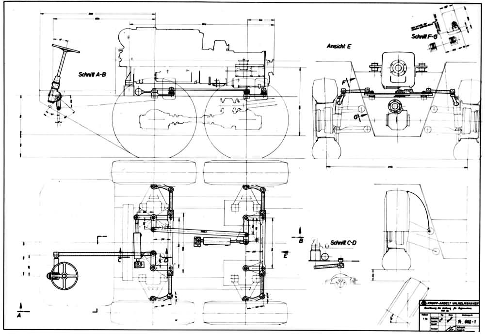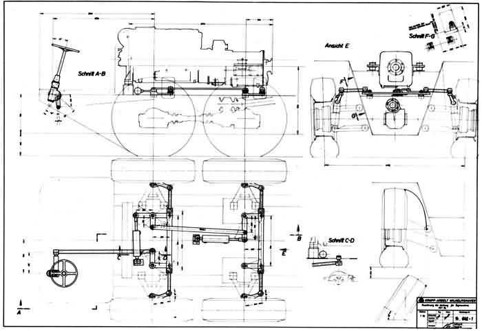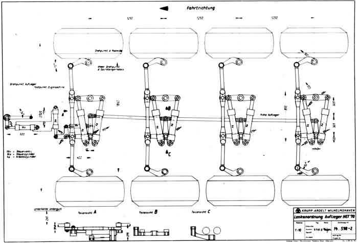 Wegen der großen Lenkausschläge und der damit verbundenen großen Kräfte muß hydraulisch mit einem Steuerkreis (ca. 60 atü) für die Lenkungseinleitung und einen Arbeitskreis für die Lenkungsausführung (ca. 150 atü) gearbeitet werden.