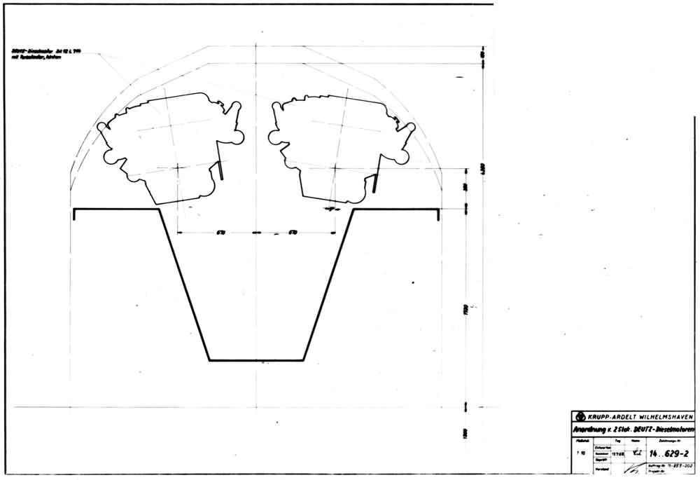 Abschließend soll die Raumbedarfsanordnung zeigen: daß auf der Zugmaschine auch 2 Stück luftgekühlte Deutz-Dieselmotoren BA 12 L 714 mit 290 PS bei 2000 U/min, also gesamt 580 PS, angeordnet werden können.