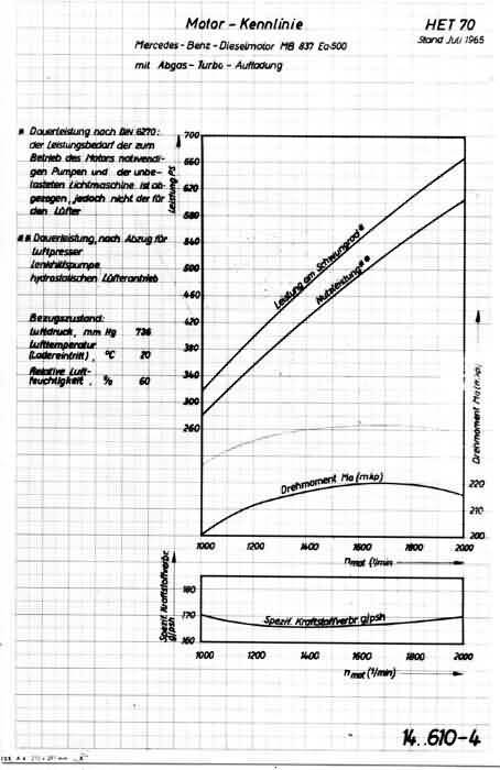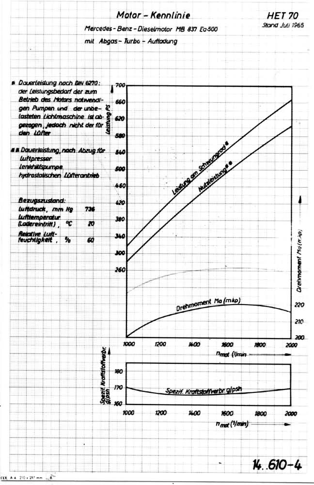Die obere Leistungskurve zeigt die Dauerleistung "B" nach DIN 6270, d. i. die am Schwungrad verfügbare Leistung und korrespondiert mit der oberen schwach gezeichneten Drehmomentenkurve. Die untere Leistungskurve, hier mit "Nutzleistung" bezeichnet, stellt die zur Verfügung stehende Leistung nach Abzug des Leistungsverzehrs für den unbelasteten Luftpresser und Lenkhilfspumpe sowie für den hydrostatischen