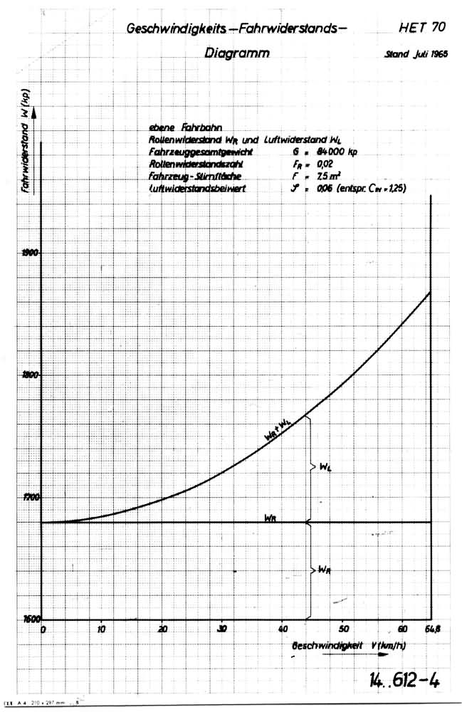 In Bezug auf den Luftwiderstand W2 gibt das Bild optisch einen falschen Eindruck, hervorgerufen durch den Maßstab. Die prozentuale Vergrößerung des Fahrwiderstandes beträgt ungünstigstenfalls bei V max = 65 km/h schätzungsweise 11 %. In den folgenden Diagrammen sind diese Fahr- und Luftwiderstände berücksichtigt.