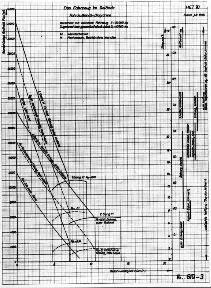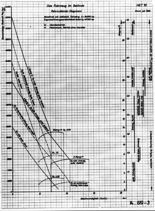 Hier sind aber die möglichen Zugkräfte für unterschiedliche Geländearten mit entspr. Rollwiderstandszahlen wie 0,05 für guten Erdweg, 0,1 feste Wiese und 0,15 für losen Sand aufgetragen. In der rechten Scala sind das Steigvermögen und die Rutschgrenzen und ihr Streubereich für verschiedene Geländezustände dargestellt.