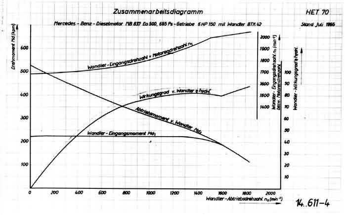 Das max. Drehmoment gibt der Wandler bei annähernd n2 = 0 ab; es beträgt ca. 525 kpm. Der Drehzahlabfall n1 zu n2 = 1680:0 entspricht einem 100 %igen Schlupf, der Wirkungsgrad ist also 0. Die gesamte Motorleistung geht dabei als Wärme ins Öl des Wandlers. Wir sehen später noch im Fahrzustands Diagramm, unter welch extremer Steigung dem Wandler dieses Moment abverlangt werden kann. Das Kühlaggregat ist so ausgelegt, daß kurzzeitige Belastung dieser Art dem Wandler nicht schadet.