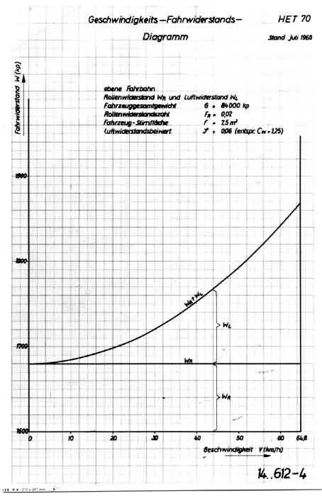 In dem Diagramm ist der Rollwiderstand des mit 47,5 t beladenen Fahrzeuges sowie der Luftwiderstand über der Geschwindigkeit aufgetragen (für ebene Fahrbahn und 20 kp/t Rollwiderstand).