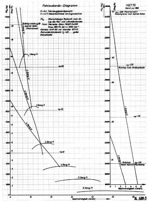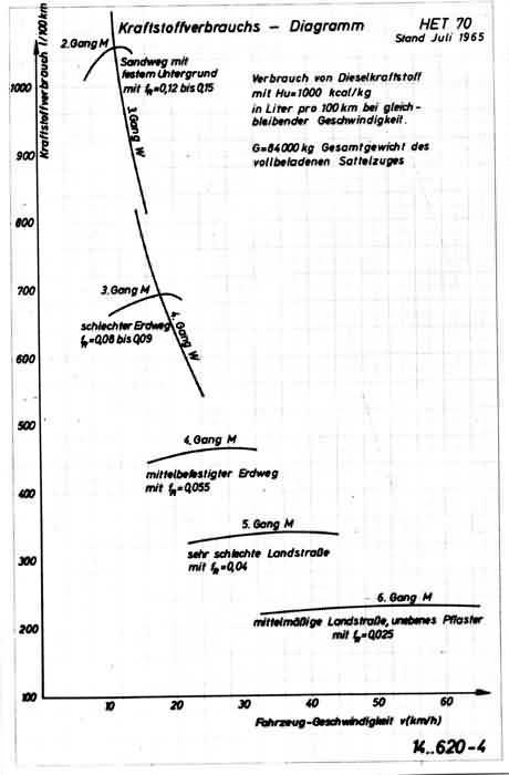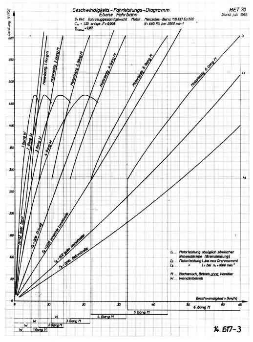 Auf Steinpflasterstraßen mit fR= 0902 wird der Leistungsbedarf größer (520 PS). Alle 3 Straßenarten können im 6. Gang gefahren werden.