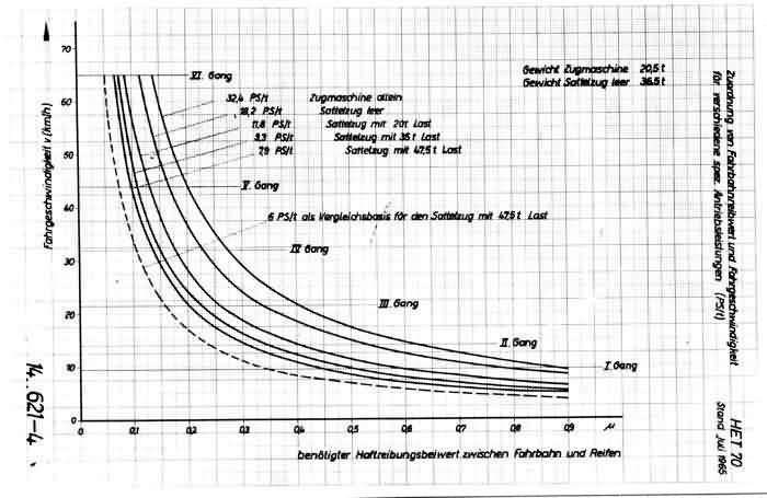 i) In dem letzten Diagramm sehen Sie die Zuord nung von Fahrbahnreibwert und Fahrgeschwindigkeit für Antriebsleistungen bezogen auf unterschiedliche Belastungszustände des Fahrzeuges, ausgedrückt in PS/t, für