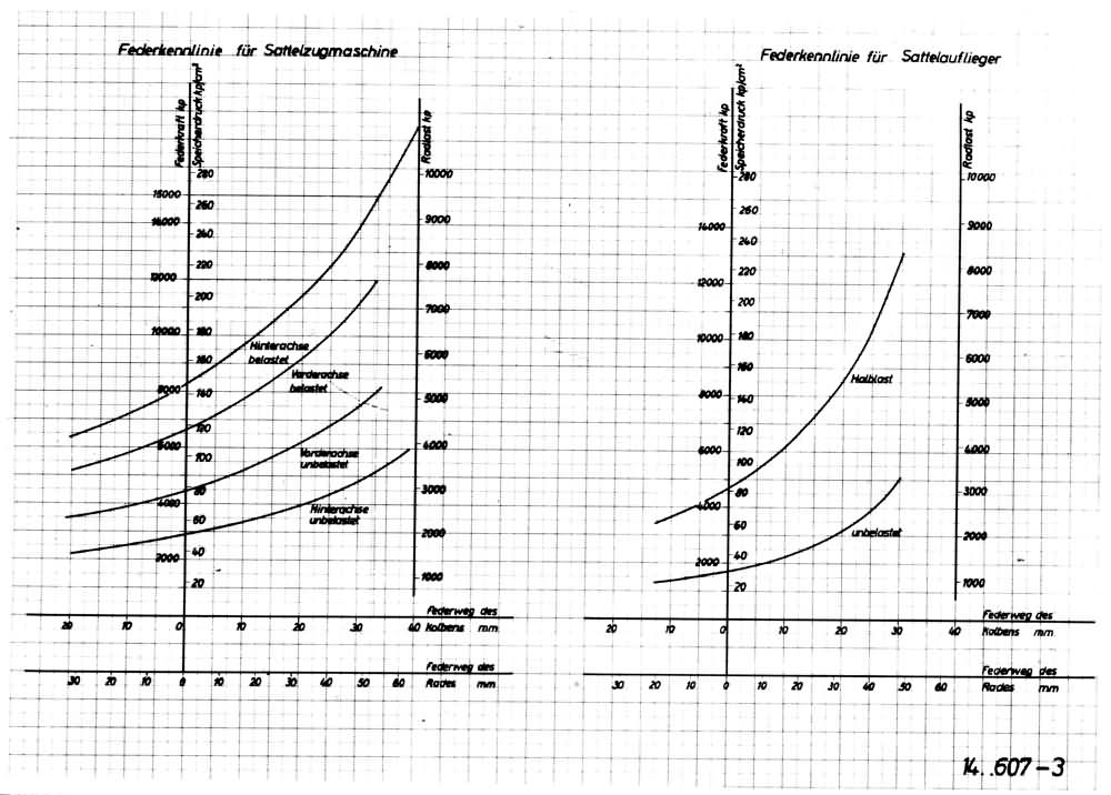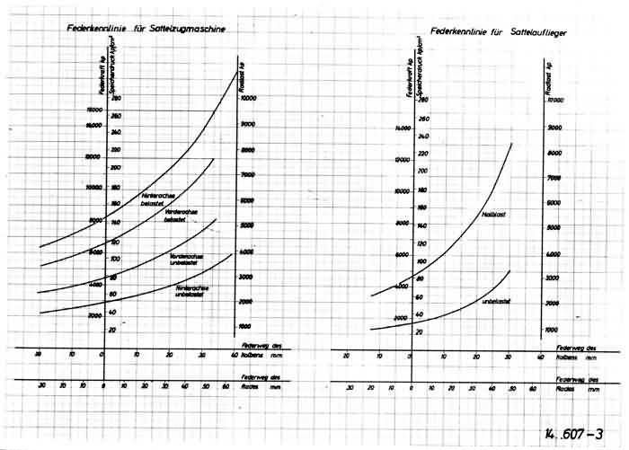Die Federkennlinien verlaufen progressiv. Für gute Federeigenschaften ist es erforderlich, daß die Federung auf die Belastung abgestimmt ist. Für die Hinterachse der Zugmaschine - belastet - haben wir eine Federung von 0,71 mm/100 kg gewählt, wie sie beim Lkw üblich ist.