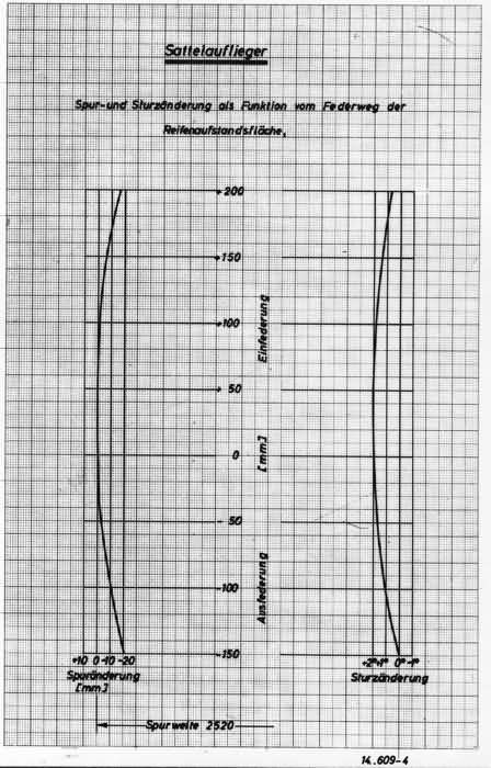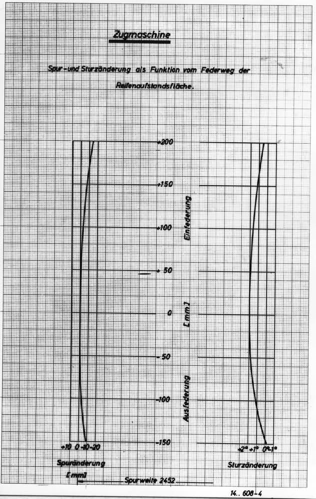 Die Sturzänderung im Normalzustand beträgt 2° und ändert sich bei, den normalen Federwegen nicht; erst bei einer Einfederung von 150 mm beträgt sie 1,2° und bei Ausfederung von 150 mm o,2°: Hierbei bleiben die Lenkfehler noch in zulässigen Grenzen.
