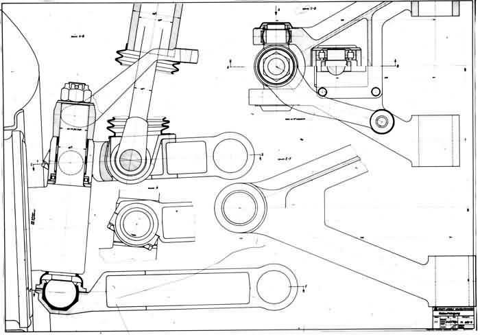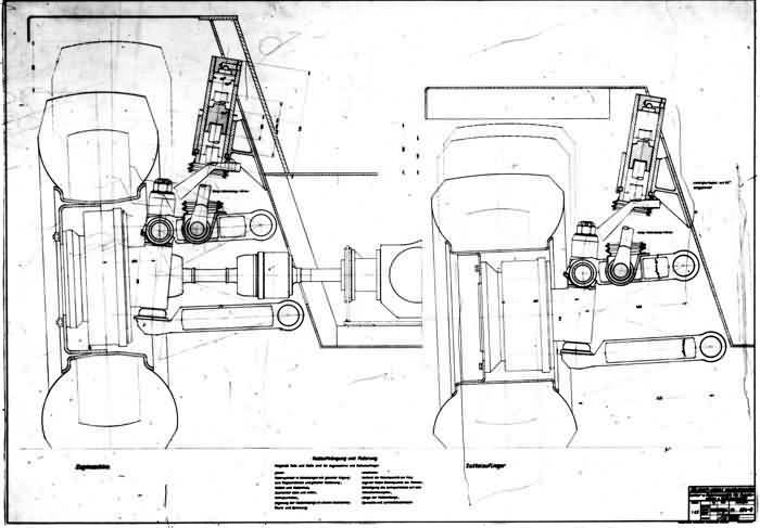 Kugellagerung unten; oben Drucklager und Halslager als Nadellager ausgebildet. Die Lagerung der Kolbenstange wird als Flanschlager in den Lenker eingesetzt. Sie ist dicht und wird oben mit dem Zyl. durch Faltenbalg abgedichtet. Die Kinematik der Querlenker gestattet einen Höhenausgleich am Rad von +150 -150 mm bei statischer Last und noch eine zusätzliche Einfederung von 53 mm bei maximaler Stoßbelastung. Die obere Begrenzung erfolgt durch den Kolben in der Endstellung.
