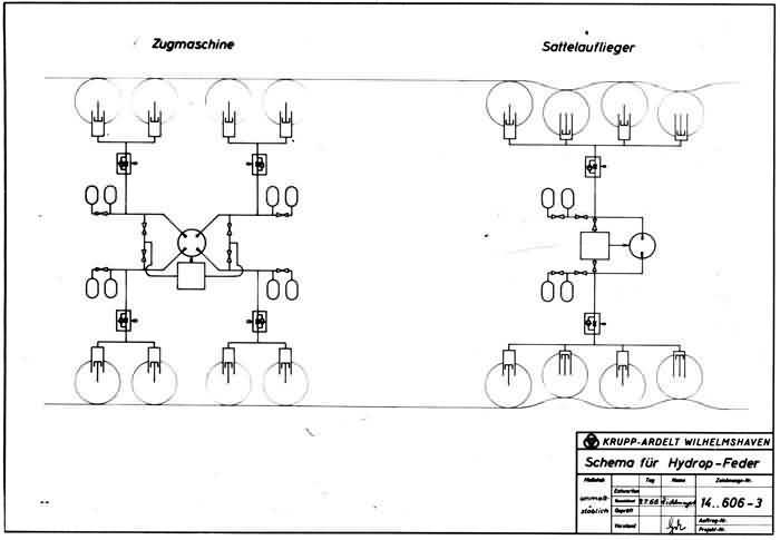 Durch eine Querverbindung (im Schaltbild nicht gezeichnet,) der Vorderachsschwingen mit Absperrhahn ist eine Dreipunktlagerung der Zugmaschine im Gelände möglich.