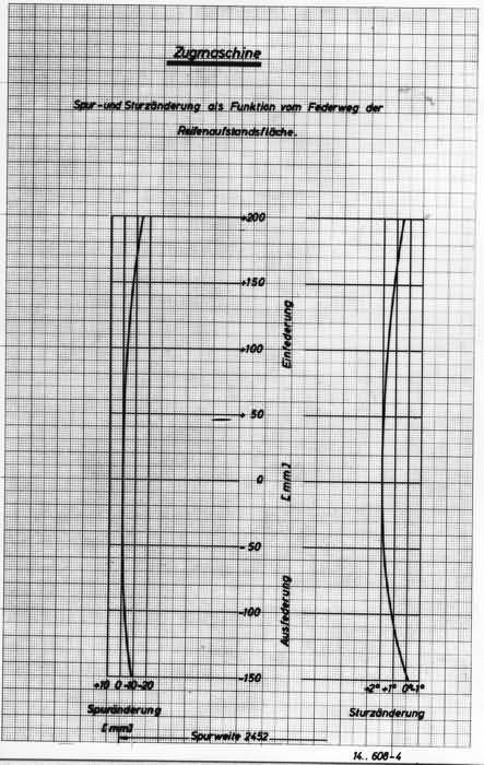Hieraus ist zu ersehen, daß im Bereich von ± 5o mm keine Spuränderung eintritt und daß bei 15o bis +150 mm Einfederung die Spuränderung 8 mm beträgt. Da bei den großen Einfederungen nur langsam gefahren wird, können diese geringfügigen Änderungen ohne weiteres von den Reifen aufgenommen werden.