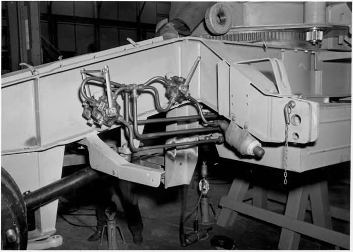 Alle 4 Zylinder einer Seite sind durch eine Schwingenleitung verbunden. Hierdurch werden gleiche Raddrücke aller 4 Räder erzielt. Bei Vollast sind die Speicherblasen abgesperrt, da die verwendeten Breitreifen selbst eine genügende Einfederung haben.