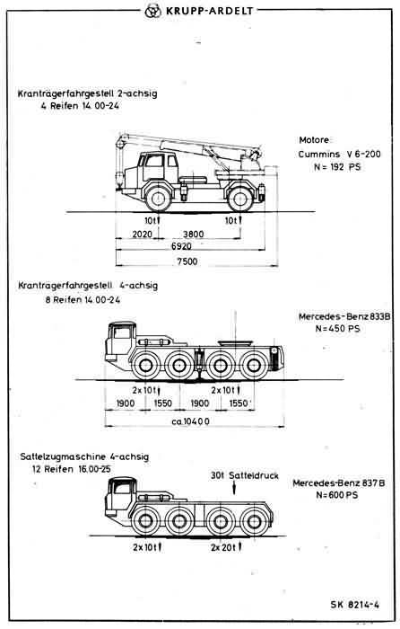 Auf diesem DIA sehen Sie im oberen Teil des Bildes einen 2 achsigen Kranwagen, der den z.Z. bei der Bundeswehr eingesetzten Kranwagen ablösen könnte. Er erfüllt die hinsichtlich Fahrzeug und Kran von seiten der Bundeswehr an uns gestellten Bedingungen. Leider ist der uns zugedachte Auftrag zur Erstellung zweier Prototypen uns bis heute noch nicht zugegangen, was wir sehr bedauern. Die Fertigung dieser Prototypen hätte uns nämlich die Lösung mancher Probleme bei, HET 70 leichter möglich gemacht.