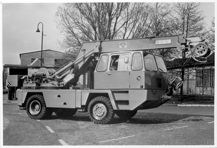 stellt den von uns serienmäßig hergestellten 6 t Autokran für den zivilen Sektor dar, der unter härtestem Einsatz gute wirtschaftliche Ergebnisse bei unseren Kunden zeitigt. Herr Grandjot führte bereits im Verlaufe seines Vortrages ein Foto über die Blasenanordnung bei diesem Gerät vor.